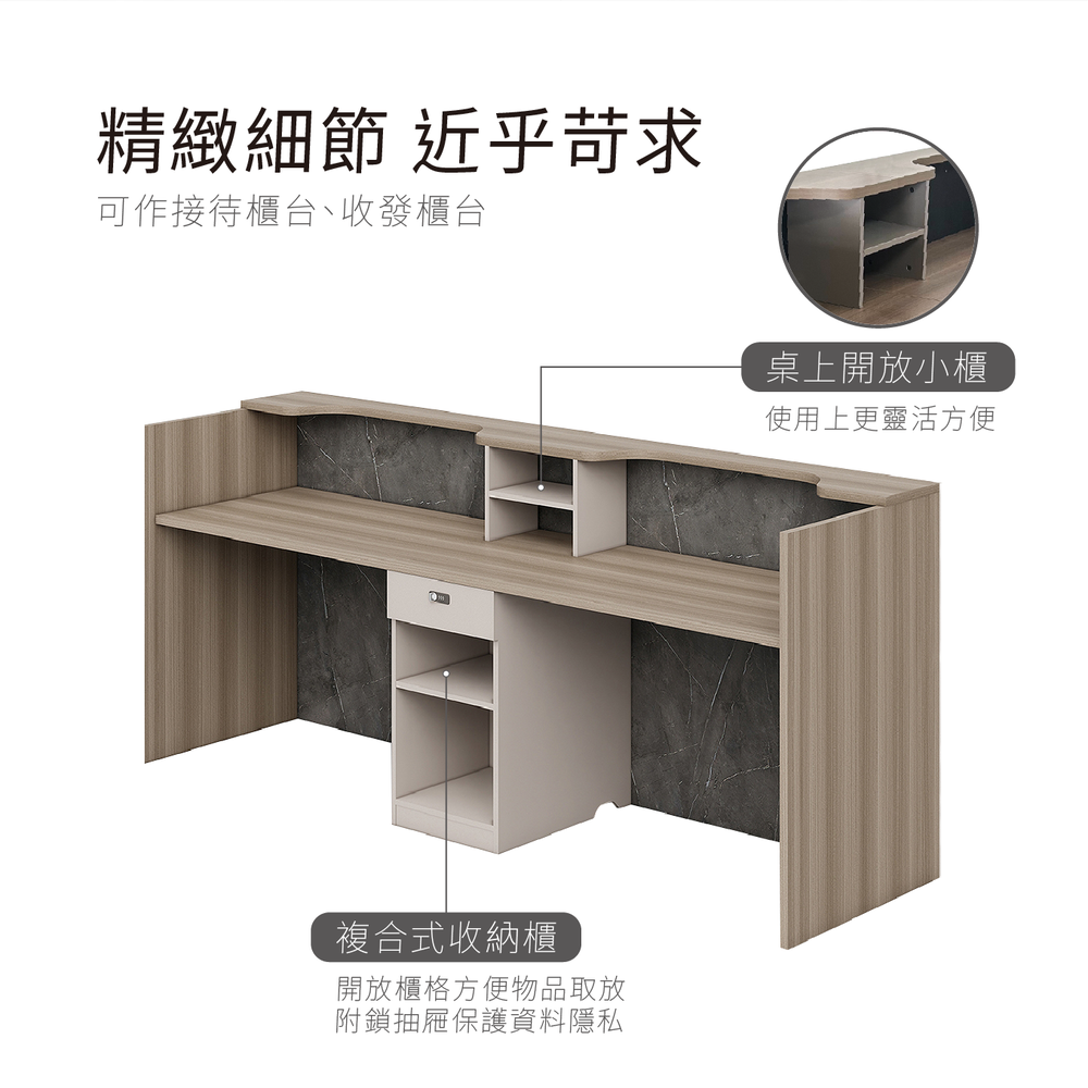 現代簡約,方正大器,內建複合式收納櫃。可作接待櫃台、收發櫃台,展現時髦的商業空間形象。 ※抽屜密碼鎖