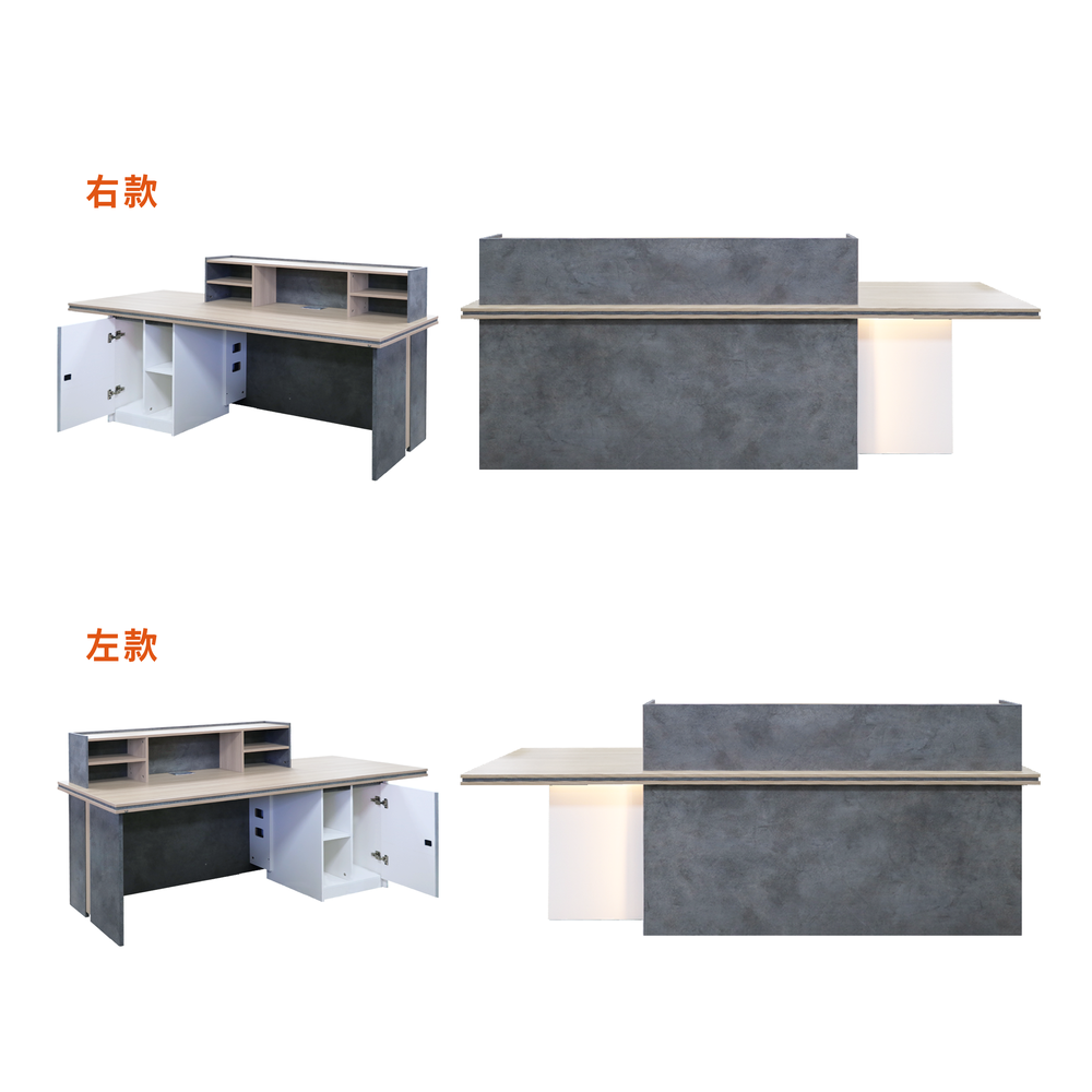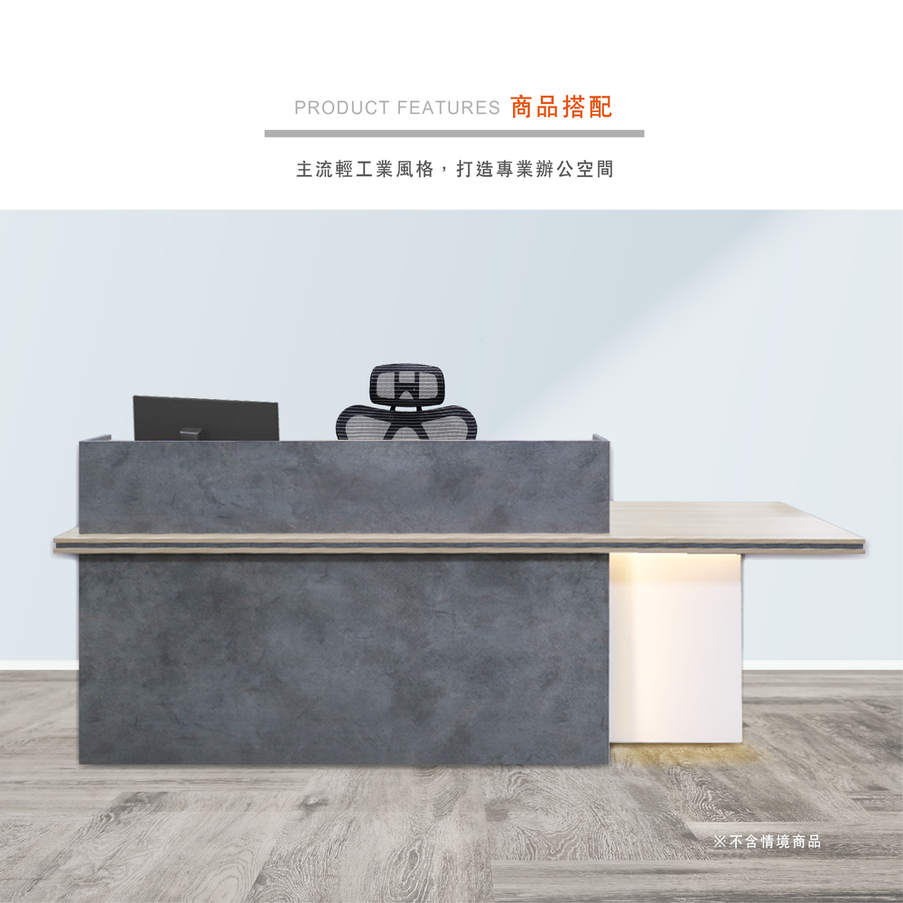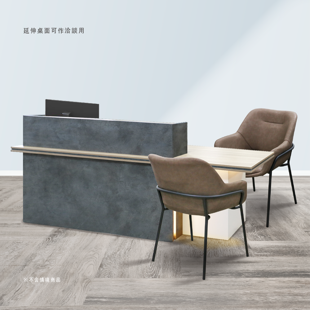 主流輕工業風格,仿石面板沈穩質感佳,隱藏式LED燈光更顯格調,延伸桌面可作洽談用,大器雅緻商務門面。
