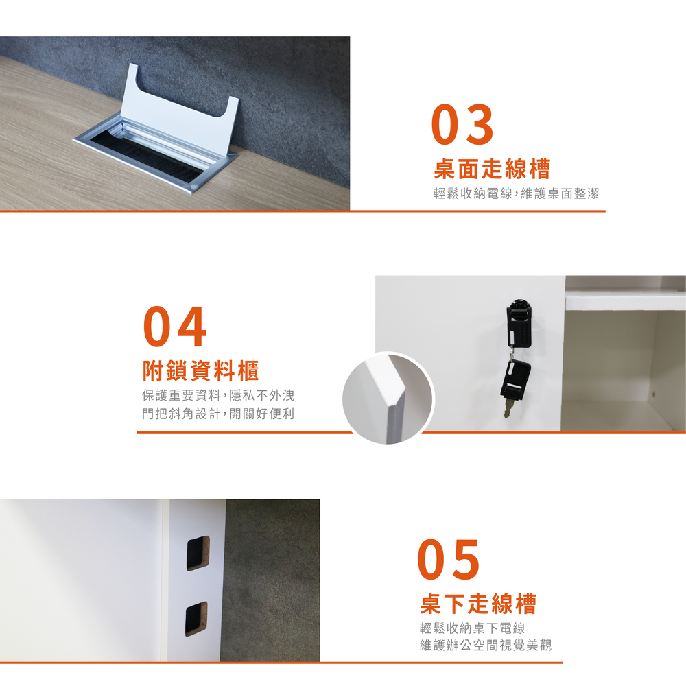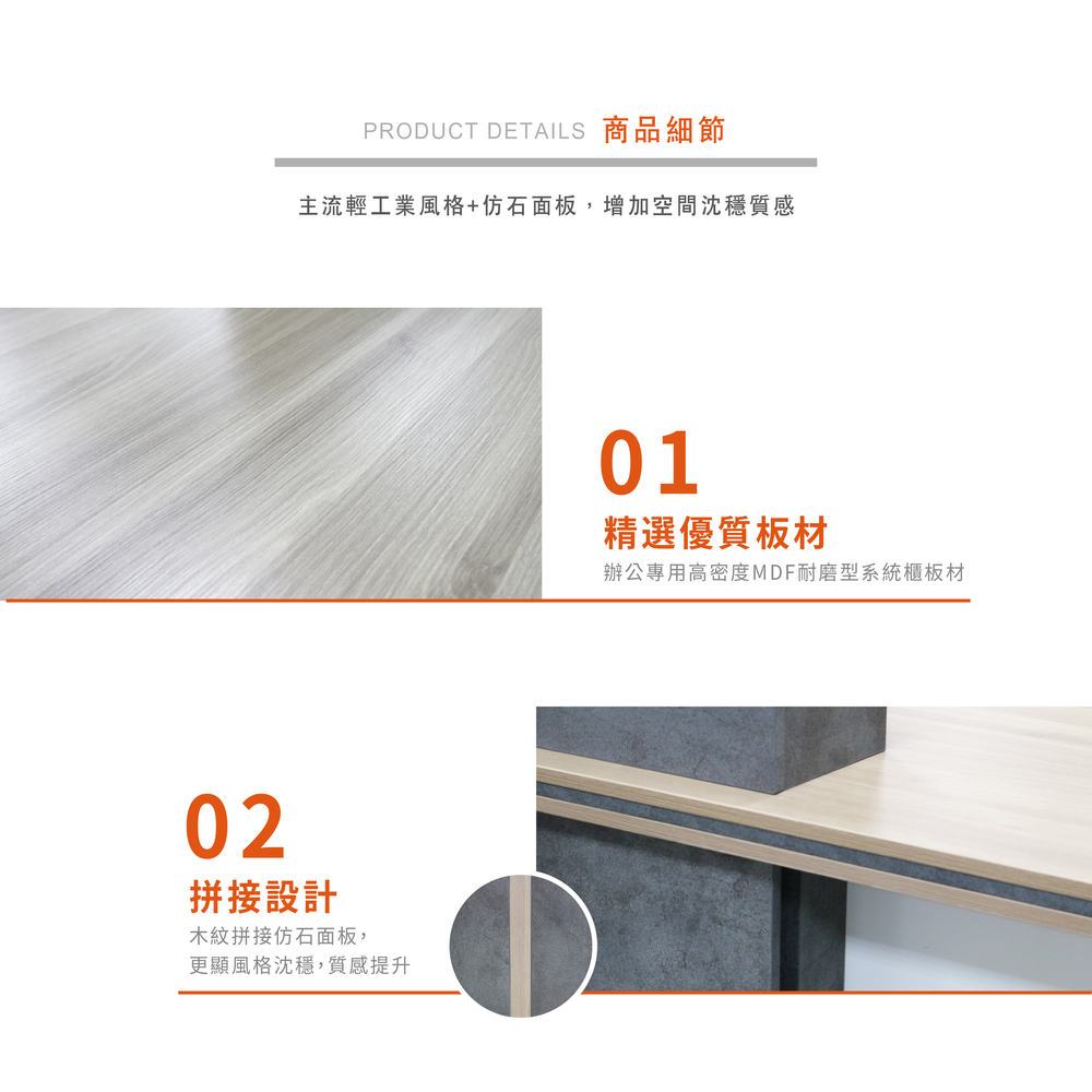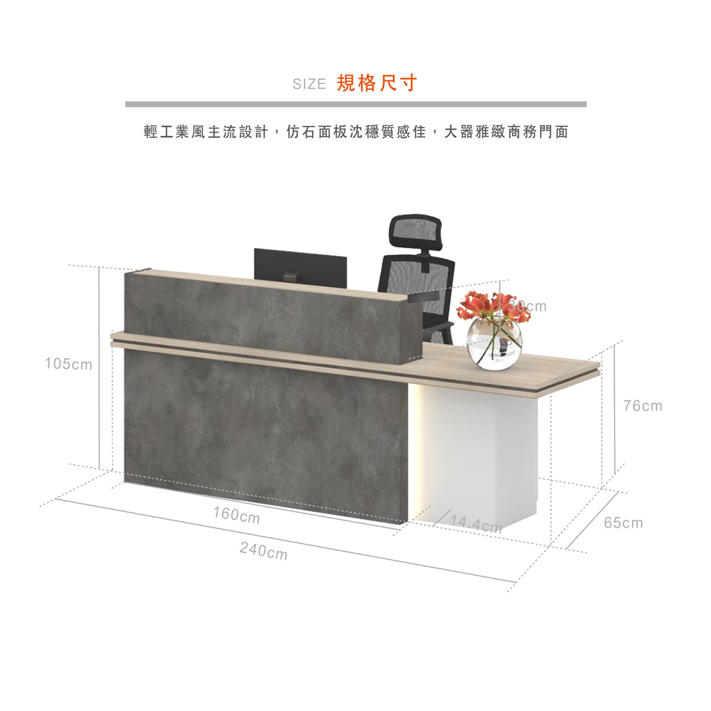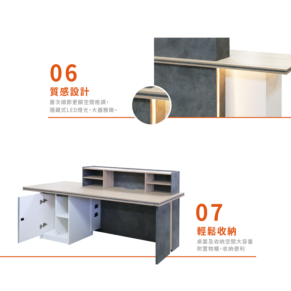 主流輕工業風格,仿石面板沈穩質感佳,隱藏式LED燈光更顯格調,延伸桌面可作洽談用,大器雅緻商務門面。