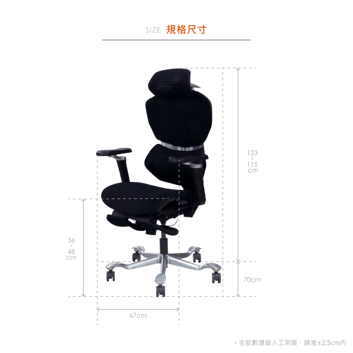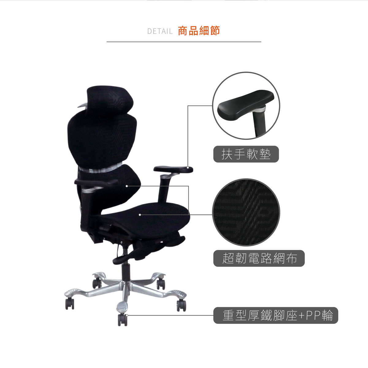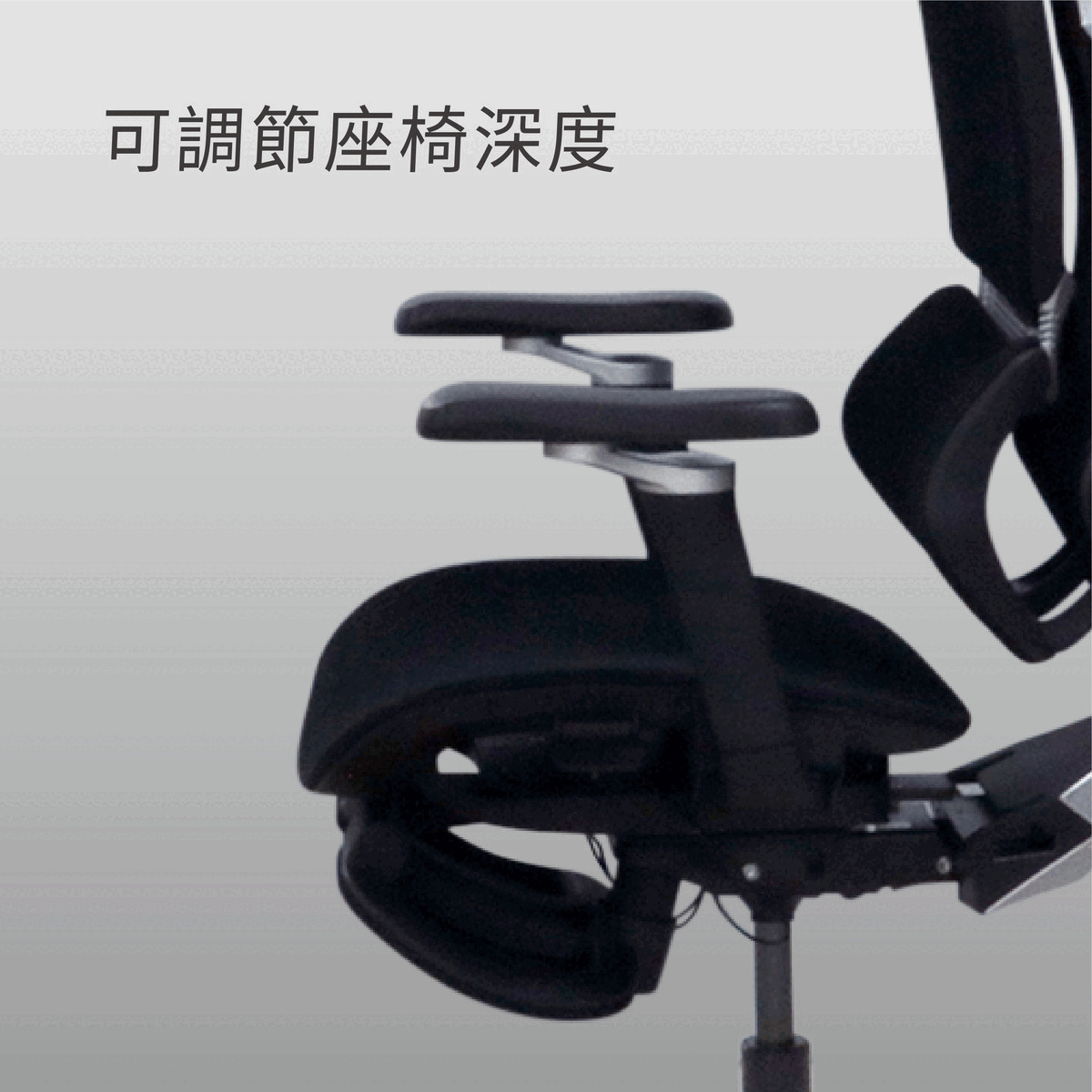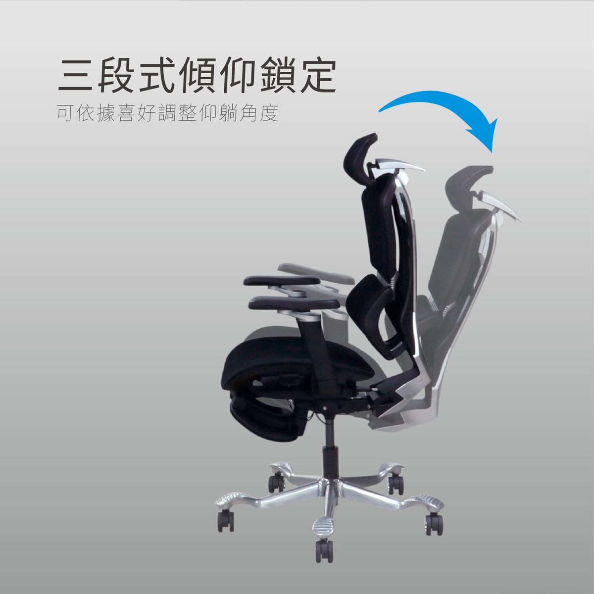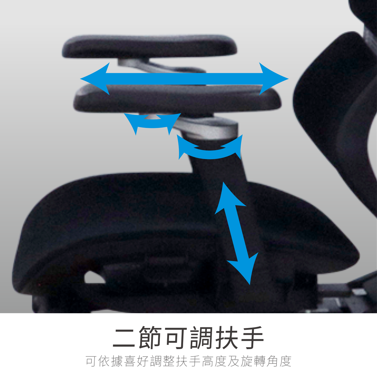 線控升降/三段式傾仰鎖定/座椅加深,雙關節頭枕&扶手,可配合身形及坐仰躺姿勢調整,久坐首選款。