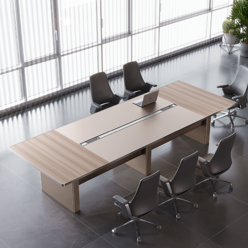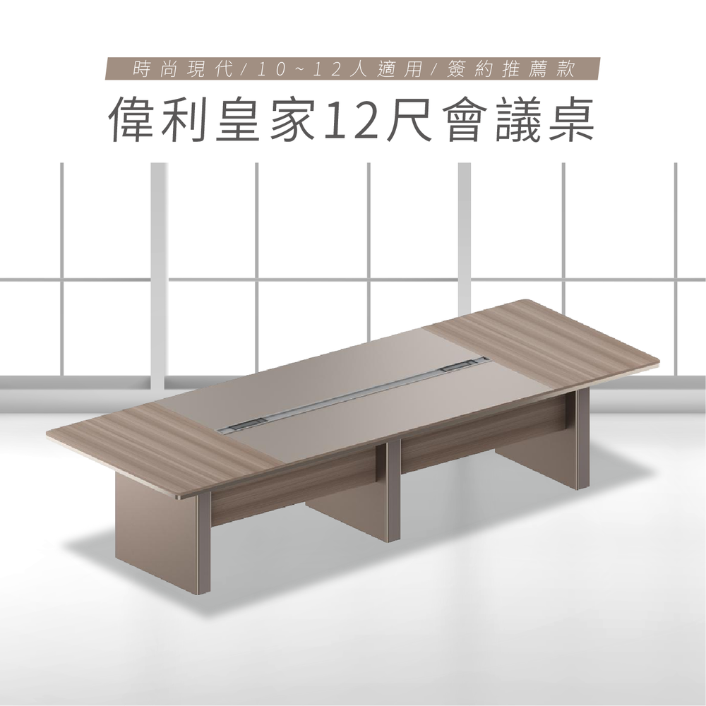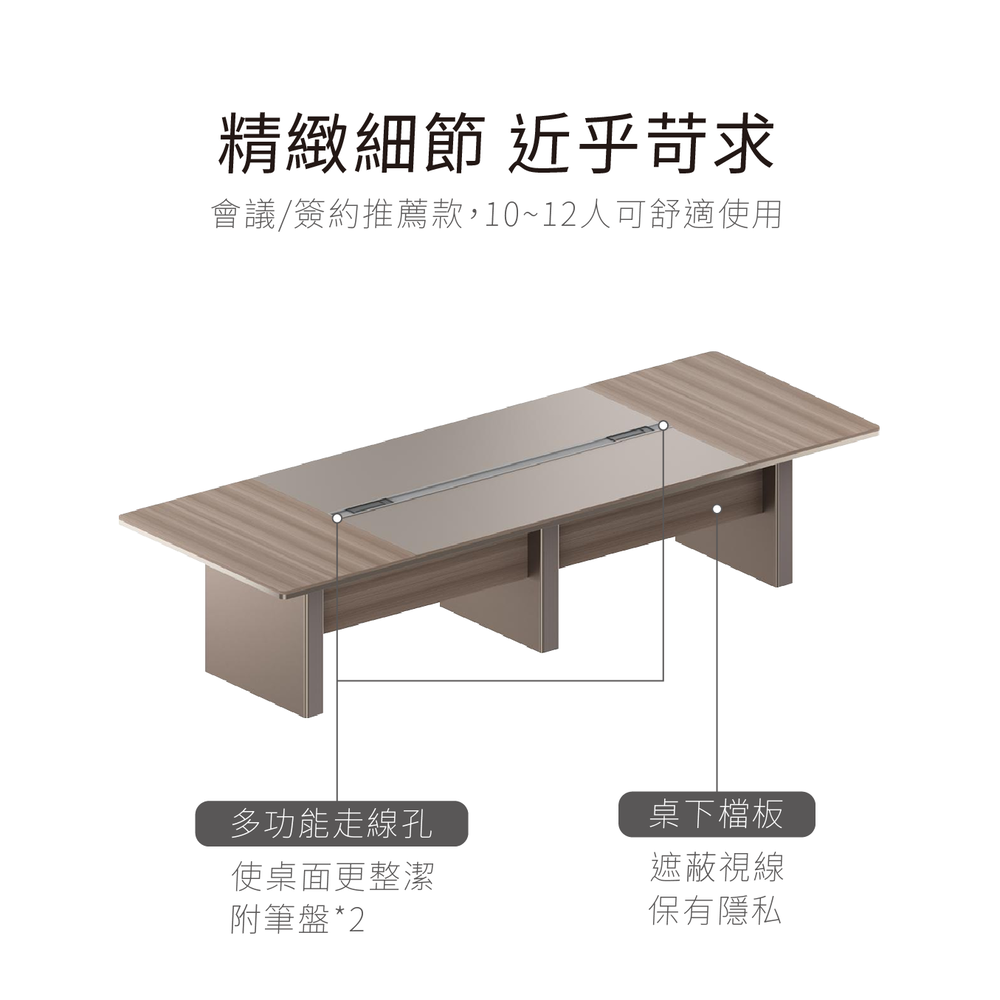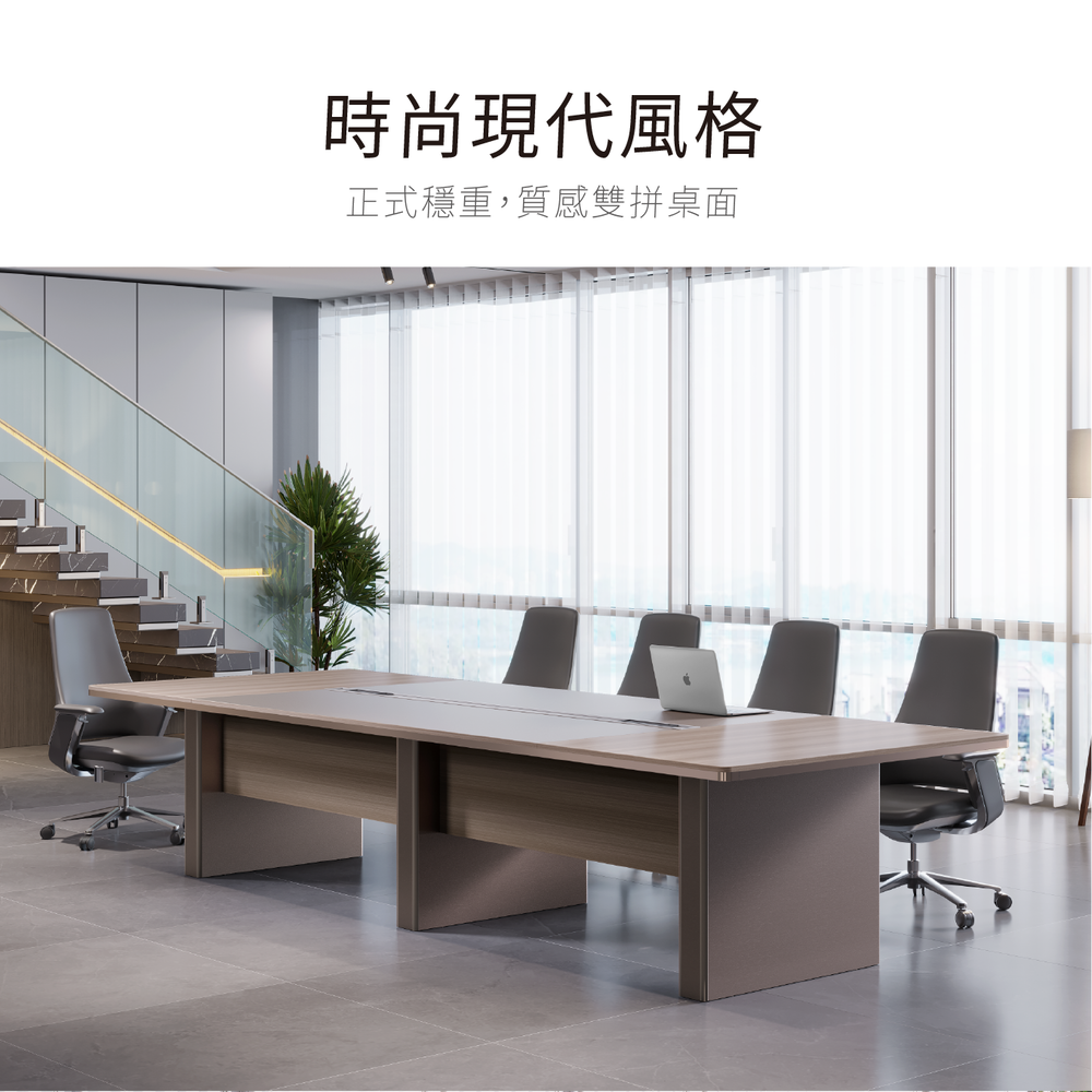 正式穩重,時尚現代,質感雙拼桌面,美觀過線設計,會議/簽約推薦款。10~12人可舒適使用。