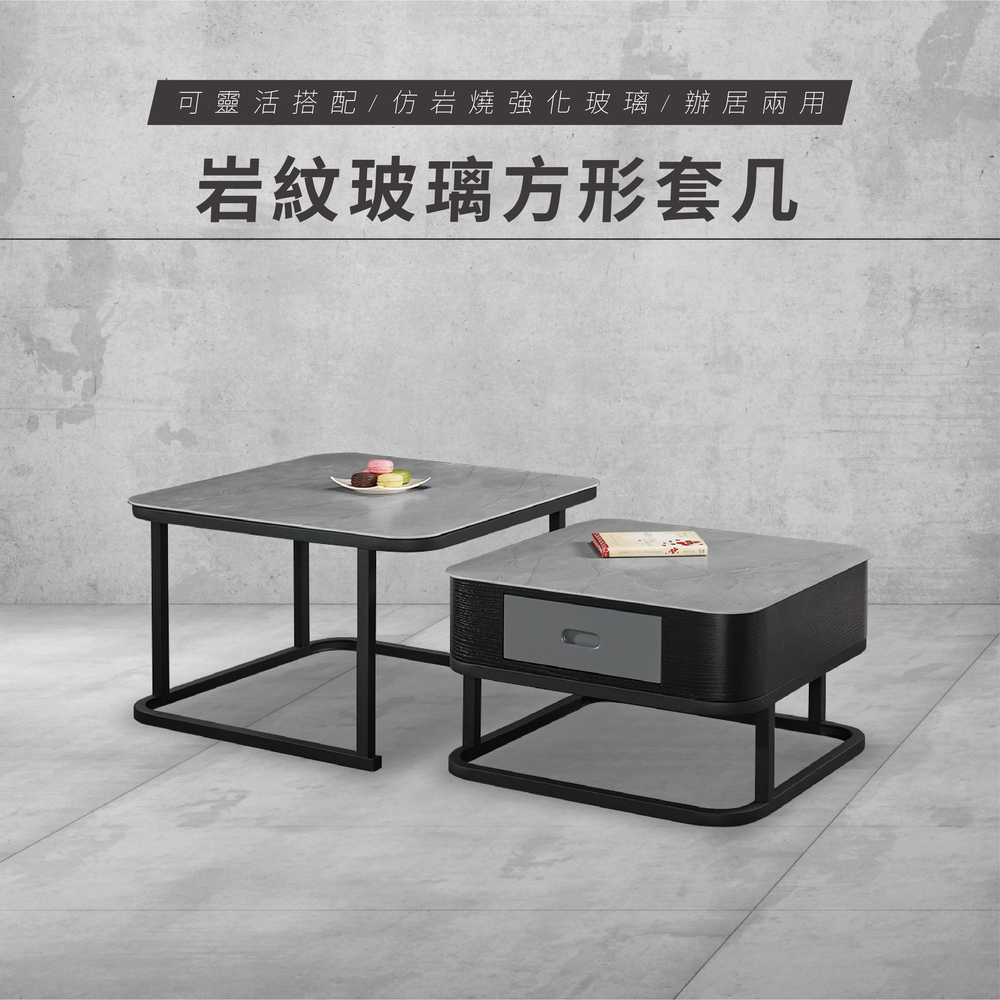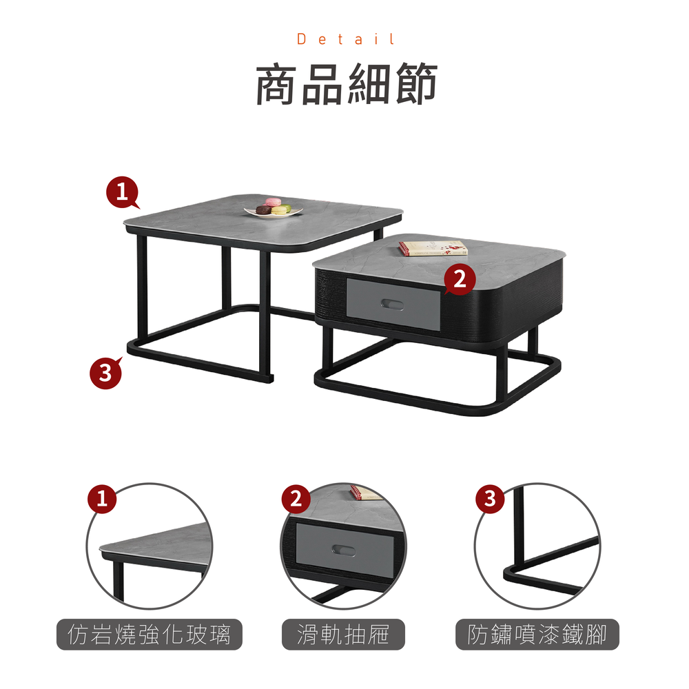 材質:仿岩燒強化玻璃、高級MDF全烤板材、防鏽噴漆鐵腳