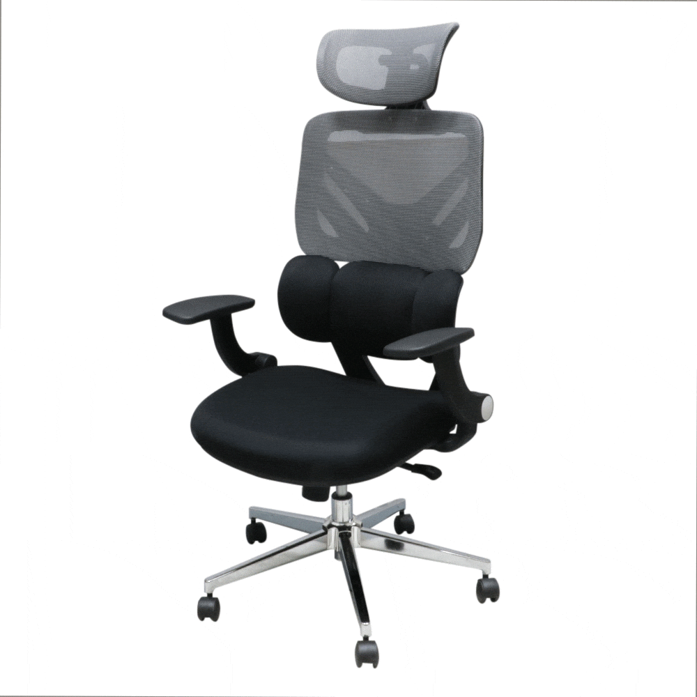 氣壓升降、無段式傾仰鎖定、頭枕可調、椅背4段高度調整、扶手可收。椅座寬大,坐感舒適支撐。